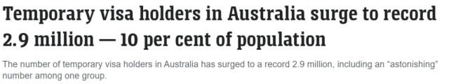 内政部数据显示,目前在澳洲,国际学生、新西兰公民、数量“惊人”的过桥签证持有者以及等待遣返的庇护申请失败者,目前已占澳洲总人口的10%。