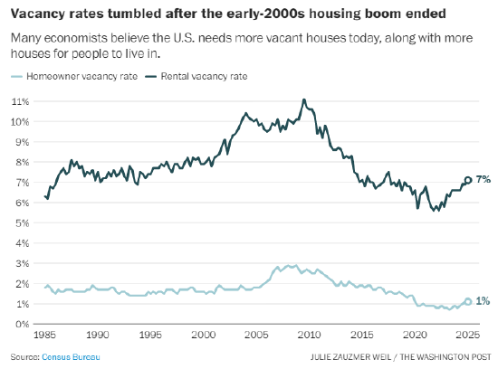 布鲁金斯学会的计算目标是恢复 2006 年12% 以上的空置率(接近历史峰值)。该机构通过复杂的统计模型,梳理出自那以后家庭组建率下降的原因中,有多少源于房价,而非年轻人就业困难、晚婚等其他因素。最终得出结论:美国需额外新增 490 万套住房。
