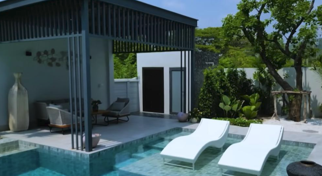 该别墅拥有四间卧室,每间卧室都带独立卫浴,配有一个5×10米的泳池,还有宽敞的开放式起居和用餐空间,门窗高度均达三米。