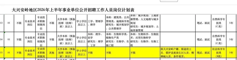 极目新闻记者查询大兴安岭地区2026年上半年事业单位公开招聘工作人员公告,确有上述岗位。据岗位招聘计划表,该岗位主管部门为大兴安岭地区行政公署民政局,单位为大兴安岭地区救助站,不限性别、专业,需大学本科(预备技师(技师)班)及以上,在其他条件里备注限大兴安岭户籍,限退役士兵,需护送流浪乞讨人员等,条件艰苦,招聘人数为1人,最低服务年限为5年。此外,记者注意到,本次招聘中,大部分岗位限大兴安岭户籍,也有少数岗位限退役士兵。