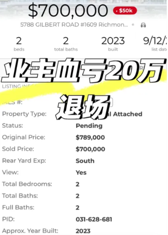 还有一套2023年建的列治文的新盘,当初也是非常火爆,业主2022年花了86.8万买的,但是现在pending价格只剩70万,可真是肉疼啊!
