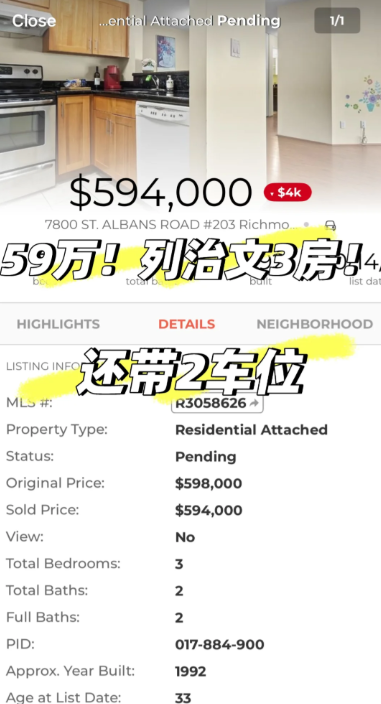 据悉这套三房两卫的公寓,居然成交价才594,000加元,要知道,这可是列治文啊,此等捡漏价,真是让人开眼了。