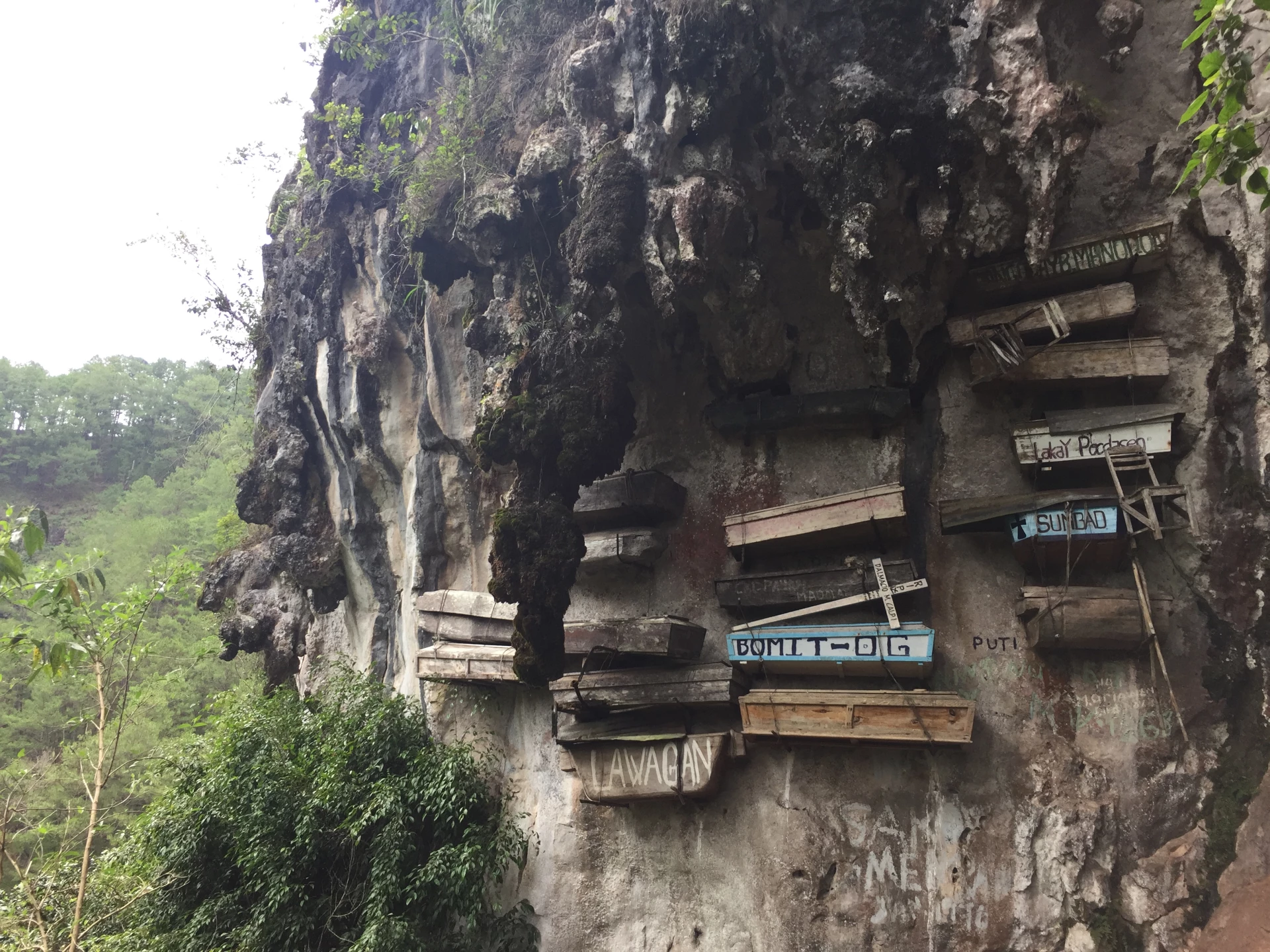 菲律宾北部吕宋岛科迪勒拉地区萨加达山城,伊戈罗特族(尤其是Kankanaey)悬棺习俗闻名,棺置崖面或高洞,常距地数英尺、多代叠放。与中国古棺不同,许多萨加达棺置于近现代,部分延续至20世纪初,后因殖民与宗教影响衰退。同样,置棺靠近祖灵、护尸免兽侵,并象征提升逝者高于生前土地。