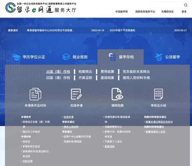 3.点击留学存档中的出国(境)存档栏目,浏览申请条件和申请材料,点击立即申请。