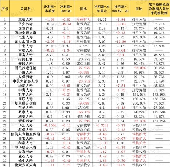 与此同时,14家险企第三季度利润降幅超20%,多家险企出现了利润减半的“腰斩”。其中下跌最为严重的恒安标准人寿第三季度净利润由2024年的4500万下降到不足80万,降幅达到82.89%,前三季度累计净利润也由去年的9200万转为亏损状态。此外,还有5家险企的亏损面仍在扩大。