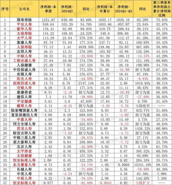 具体来看,头部险企领跑优势进一步强化,国寿寿险与平安寿险今年前三季度净利润均超千亿。仅国寿、平安两家险企利润总额就占据行业利润的58.81%,是行业利润贡献大头。另外,太保寿险、新华保险、泰康人寿、太平人寿、人保寿险、友邦人寿6家利润也超过百亿。