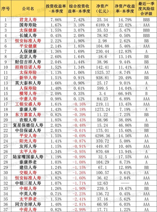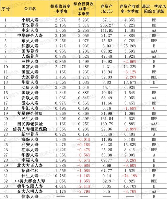 综合投资收益率方面,有5家险企第三季度单季的综合投资收益率超过3%。在这5家险企中,国寿寿险、太保健康、平安养老均为“老五家”出身,而君龙人寿、小康人寿分别以7.42%、5.23%的数据位列第三季度“投资高手”前二甲。