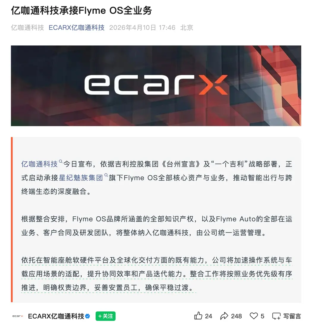 据介绍,2026年1月,吉利控股进一步发布“一个吉利,全面领先”2030战略目标,通过强化顶层统筹与全球协同,推动关键指标达到全球车企领先水平。此次Flyme OS资产从星纪魅族整合至亿咖通科技,正是这一战略框架下的具体落地举措。