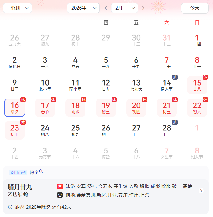 不过因为时间较长,有两天补班:2月14日(周六)、2月28日(周六)上班调休。