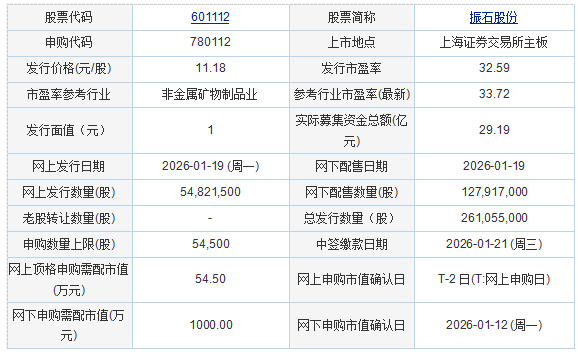 振石股份2026年1月16日披露的首次公开发行股票并在主板上市发行公告显示,按本次发行价格11.18元/股和26,105.5000万股的新股发行数量计算,若本次发行成功,预计公司募集资金总额291,859.49万元,扣除约14,312.68万元(不含增值税)的发行费用后,预计募集资金净额277,546.81万元。