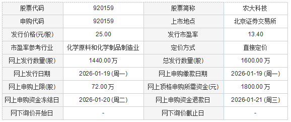 农大科技2026年1月15日披露的向不特定合格投资者公开发行股票并在北京证券交易所上市发行公告显示,若本次发行成功,预计公司募集资金总额40,000.00万元,扣除发行费用4,193.44万元(不含增值税)后,预计募集资金净额为35,806.56万元。