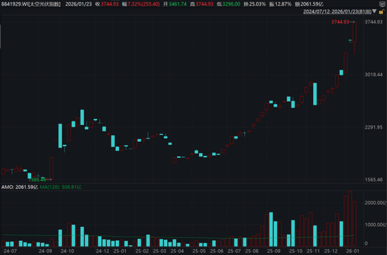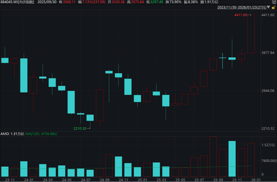 值得注意的是,万得太空光伏指数(8841929.WI)周线级别放量过大,这既可以视作板块人气火热,又可以理解为买卖双方在此位置大范围换手。板块的进一步上涨,自然需要同等甚至更大规模资金的“支援”。