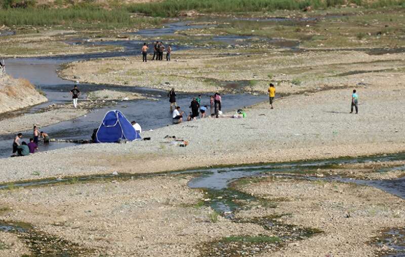 当地时间2025年8月25日,伊朗德黑兰北部法沙姆地区,伊朗民众在一个几乎干涸的河床内野餐。视觉中国 资料图