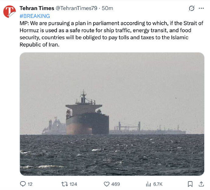 伊朗议员称拟征收霍尔木兹海峡通行费 Source [伊朗议员称拟征收霍尔木兹海峡通行费]#伊议会推动霍尔木兹海峡通行收费#伊朗《德黑兰时报》社交账号3月19日消息称,据伊朗议员透露,伊朗议会正在推动一项法案,根据该法案,如果霍尔木兹海峡被用作船舶交通、能源和粮食运输的安全通道,相关国家有义务向伊朗支付通行费和税款。(环球时报-环球网报道 记者 张志文) 点击进入专题: 关注伊朗局势 责任编辑:张玉