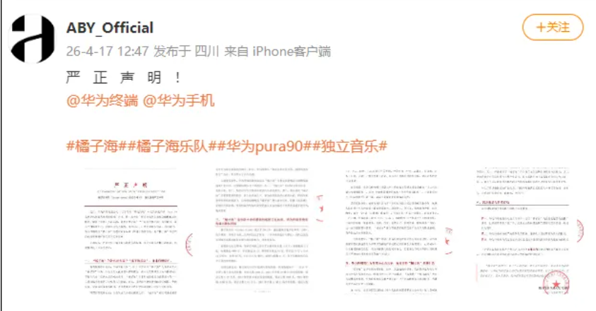 而在此前4月17日,独立摇滚乐队橘子海及经纪公司发布声明,直指华为终端在Pura 90系列手机营销中,未经授权大规模使用 “橘子海” 概念进行商业推广。