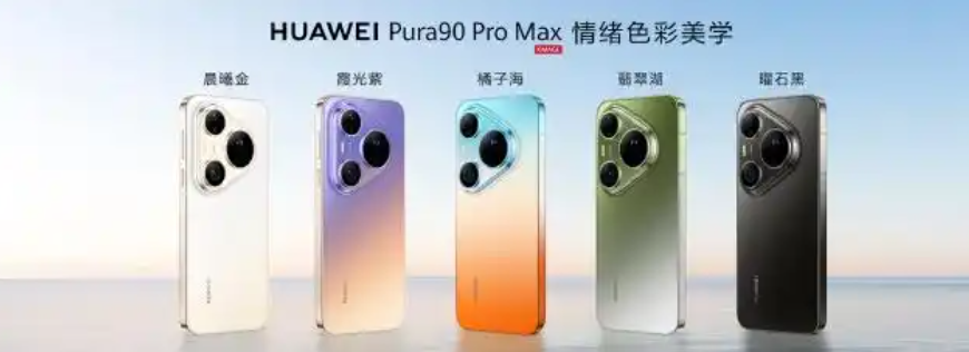 外观方面,Pura 90 Pro Max 采用一体化镜头 Deco 与直边中框设计,线条简洁干练,握持稳固,整机支持 IP68+IP69 级防尘抗水。机身共推出曜石黑、橘子海、翡翠湖、霞光紫、晨曦金五种配色。