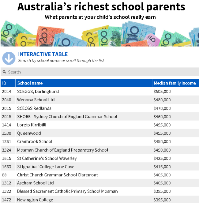 全国最“壕”的学校是悉尼的 SCEGGS Darlinghurst 女校,家长家庭收入中位数高达 50.5万澳元,是全澳唯一超过半百万的学校。