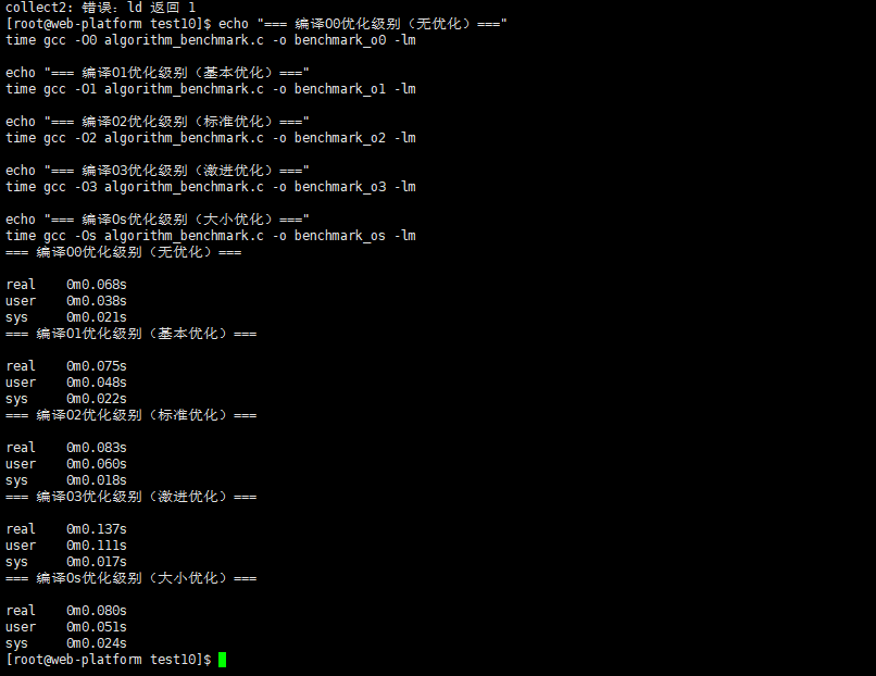 - 优化级别的影响:O2优化在编译时间和运行性能之间提供了最佳平衡,相比O0优化,程序运行速度提升约3-5倍,而编译时间仅增加约90%。
