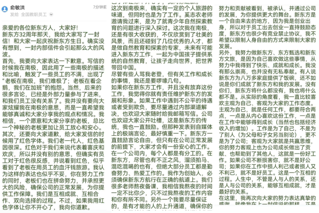 事后,俞敏洪再发全员信致歉。他一方面回应此前争议,另一方面称允许员工吐槽一直是新东方的传统,但发表到自媒体上的极端言论,最好慎重。