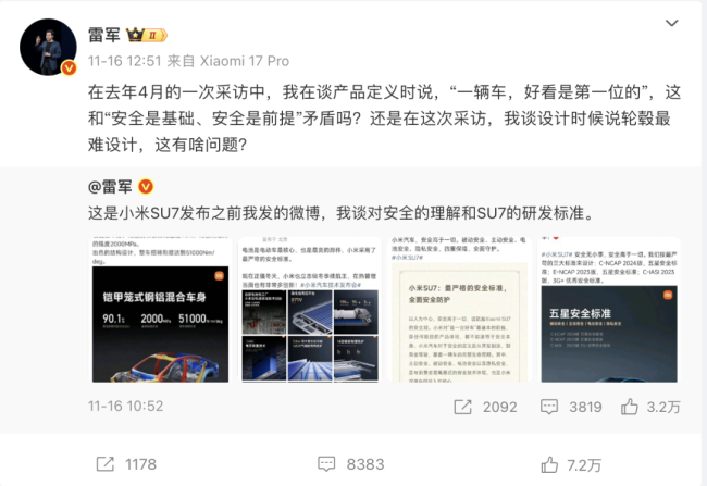 为自证清白,一向不疾不徐的雷军连发三条微博,不仅搬出小米SU7发布前他曾谈及安全的文章,还质问网友:“我在谈产品定义时说,‘一辆车,好看是第一位的’,这和‘安全是基础、安全是前提’矛盾吗?还是在这次采访,我谈设计时候说轮毂最难设计,这有啥问题?”