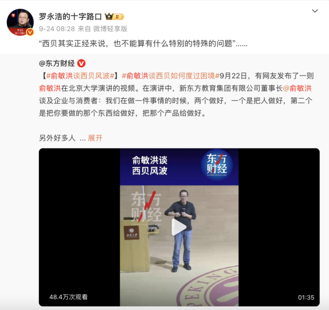 俞敏洪本意是解释企业与消费者的关系,分享产品经验。视频传出后,罗永浩隔天转发,文案摘取“西贝……不能算有什么特殊的问题”,并附上一串省略号。