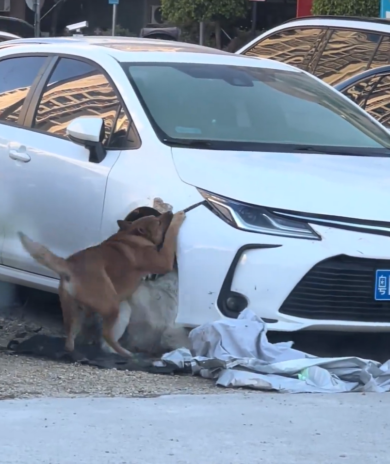 可以看到一黄一白两条狗正在这辆卡罗拉的右前疯狂撕咬,导致保险杠一边翘起,白狗钻了进去撕扯线束,而黄狗直起身子两条腿搭在车头上啃得不亦乐乎。