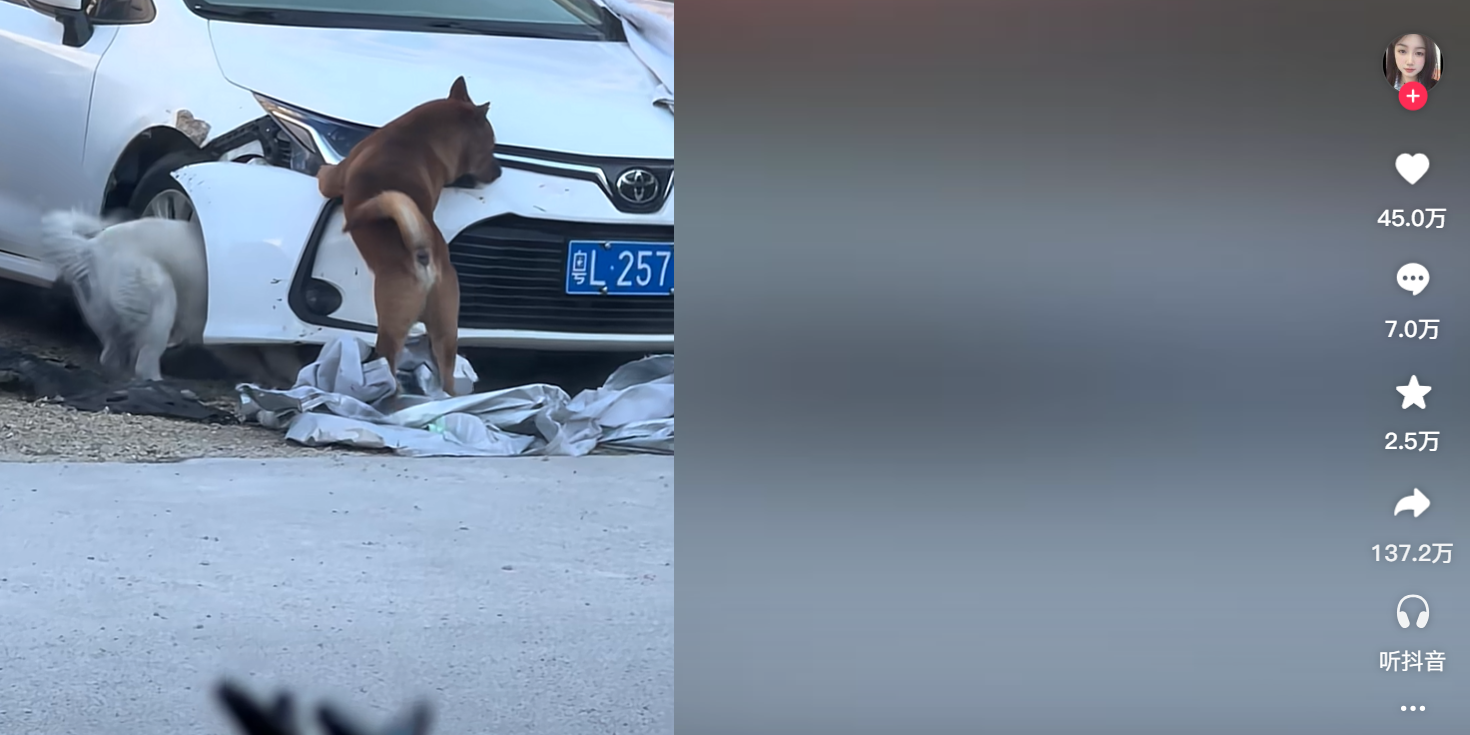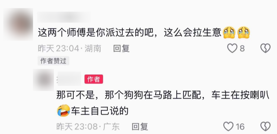 然而视频发布者则在评论区讲述了不一样的故事:这辆车的车主表示,当时这两只狗在马路上“匹配”(你懂的)挡住了路,于是按了喇叭驱离它们,这无疑坏了它们的好事,因此遭到报复。