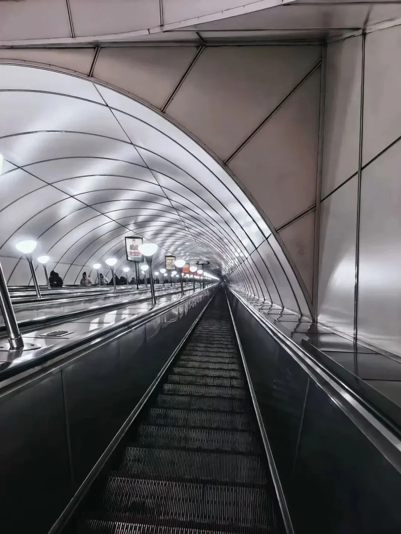 除了饮食,交通上的体验也同样难忘,尤其是搭乘地铁。俄罗斯的地铁站十分华美古朴,每一站都像一座地下宫殿,但站内却没有电动扶梯,更没有直梯。我不得不拖着24寸的行李箱,在长长的步梯上来回奔波。一些核心枢纽站的出入口设有扶梯,但往往长得惊人。我坐过最长的扶梯,从踏上到离开足足需要一分多钟,站在上面甚至忘不到尽头。对于有恐高症的人来说,这实在是个挑战。