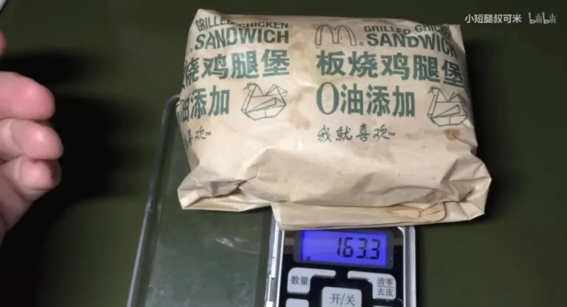 ▲ 小短腿叔可米2017年的视频板烧鸡腿堡重量在163.3g。图 / bilibili@小短腿叔可米