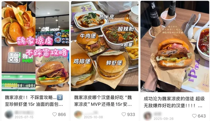 还有跨界而来的对手。在最近对麦当劳汉堡的审判中,经常有网友在评论区晒出来自“魏家凉皮”的汉堡新品,在“又瘦又小”的双吉对比下,厚度十分可观。