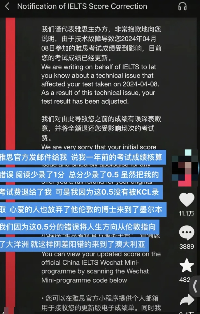 近期一些考生突然受到了来自雅思官方的道歉信,内容大致意思是,由于考试机考系统出现技术失误,考生的考试成绩可能不准确,目前官方已经重新评估分数,并且全额退费。