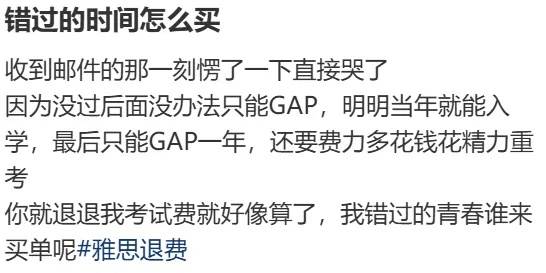 雅思官方可以退费和补偿,却无法挽回学生的时间,也弥补不了错过的机会。
