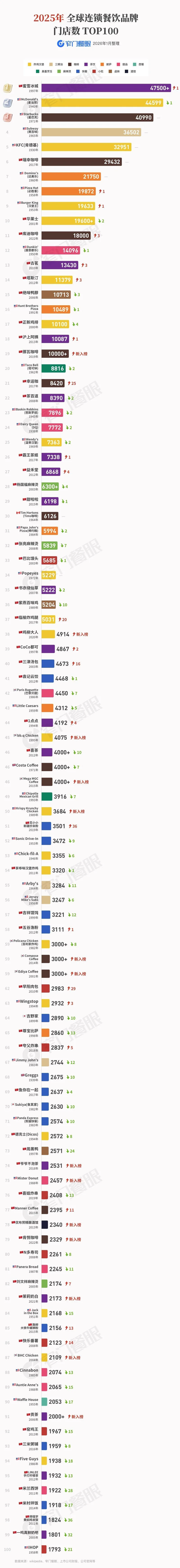 麦当劳位居次席,全球门店数量达到44599家,遍及100多个国家和地区。中国内地是其最重要的海外市场,截至2025年12月,已拥有7700多家餐厅,超过20万员工,2025年服务顾客超过14亿人次。
