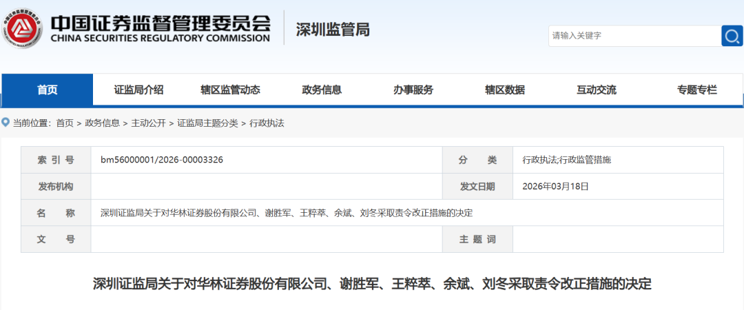 2026年3月18日,深圳证监局发布《深圳证监局关于对华林证券股份有限公司、谢胜军、王粹萃、余斌、刘冬采取责令改正措施的决定》。