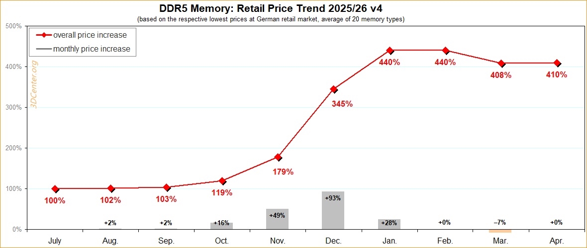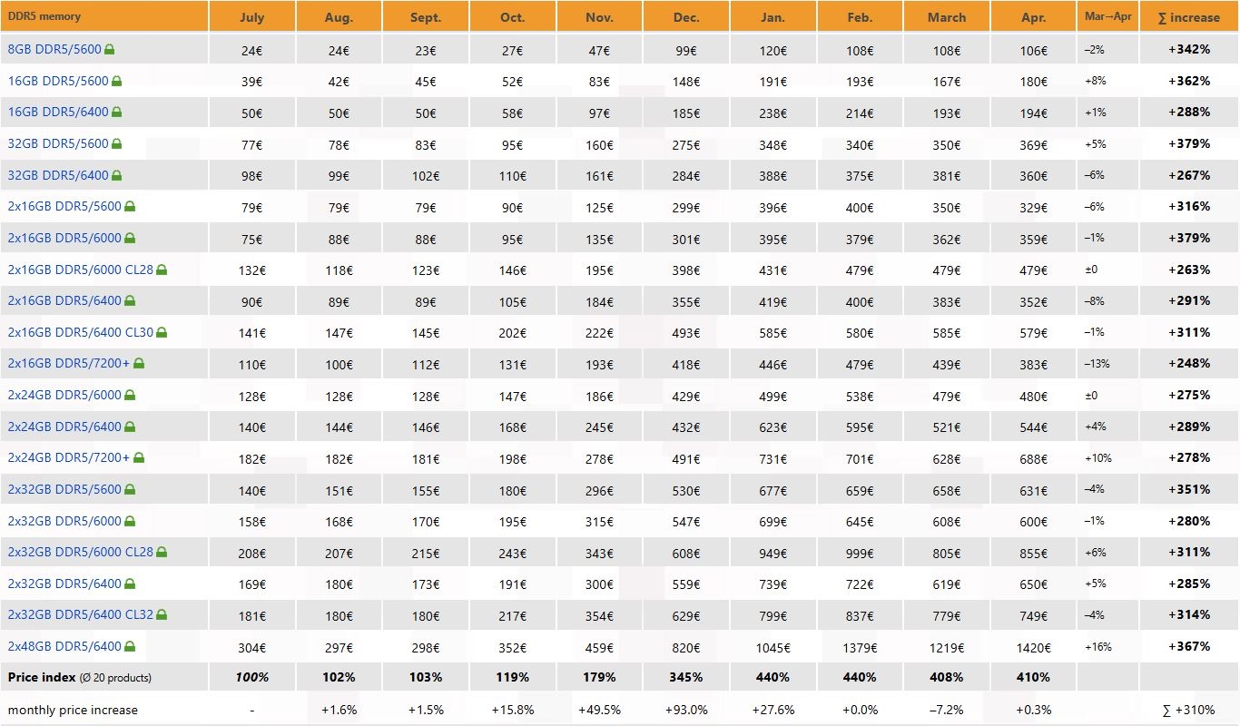 3DCenter的数据覆盖多家德国零售商的多款DDR5内存产品,能较为准确地反映该国DRAM市场的真实状况,虽然德国市场未必完全代表全球走势,但其他地区已出现类似趋势。