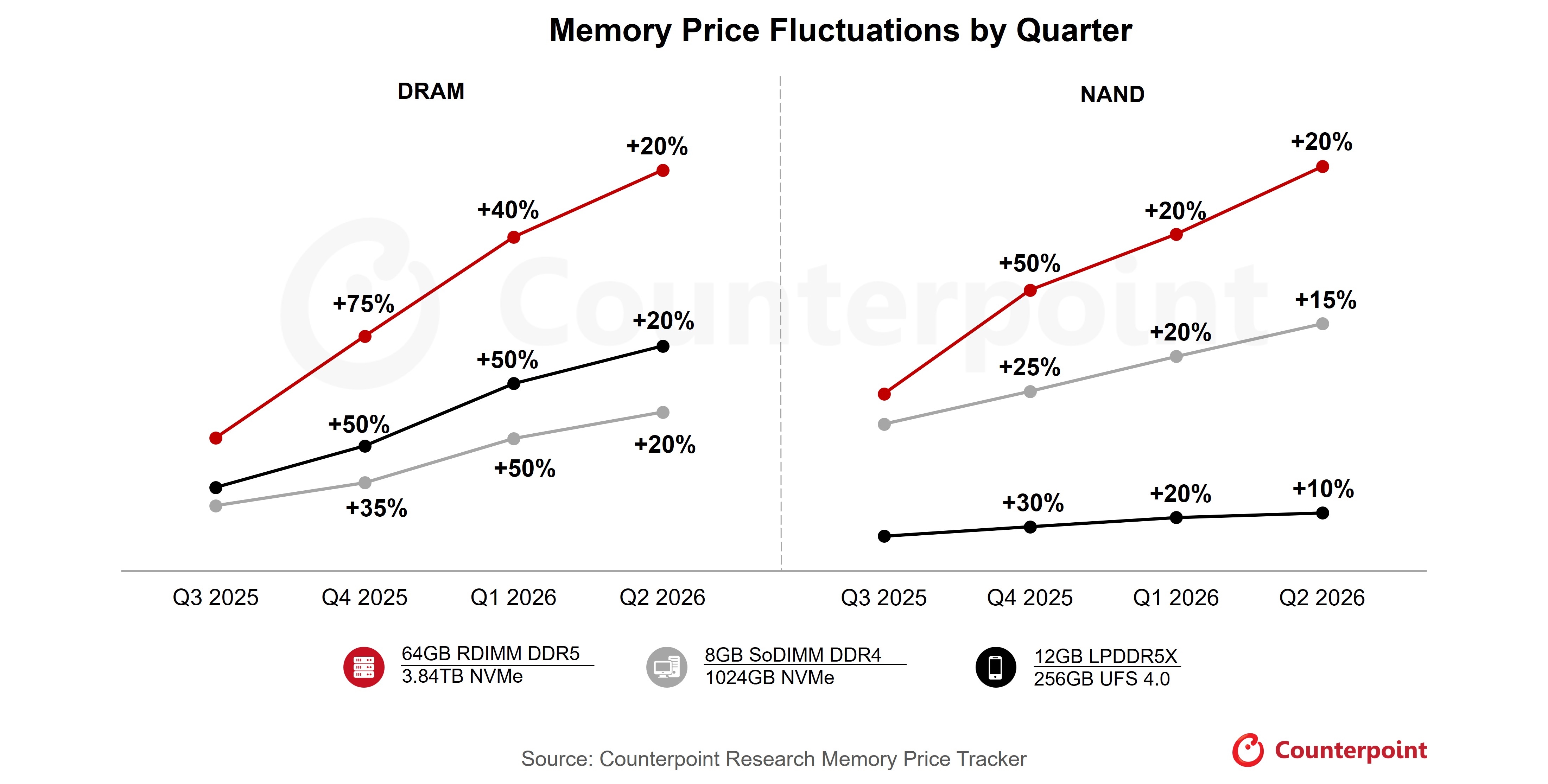 数据显示,2025年第四季度内存价格大幅上涨40%–50%,Counterpoint预计,2026年第一季度仍将再涨40%–50%,而2026年第二季度价格还将继续上涨约20%。