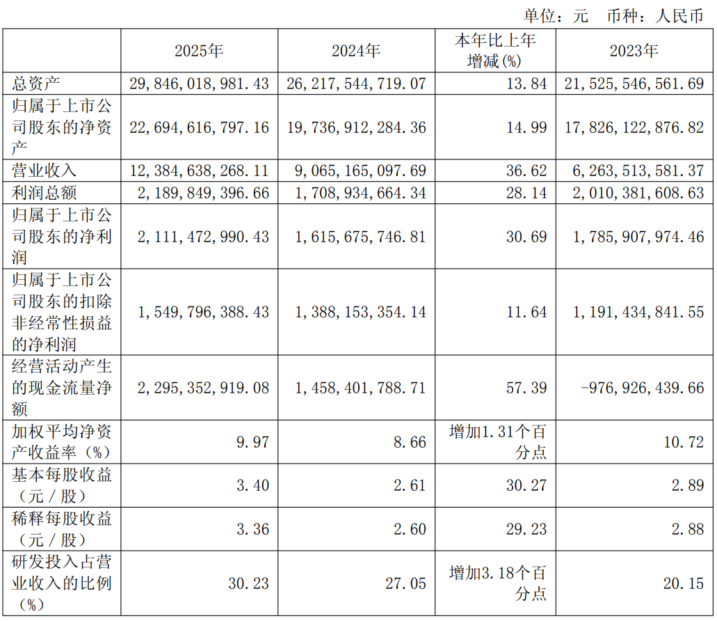 2025年,中微公司实现营业收入123.85亿元,同比增长36.62%;实现归属于母公司所有者的净利润约21.11亿元,同比增长约30.69%。