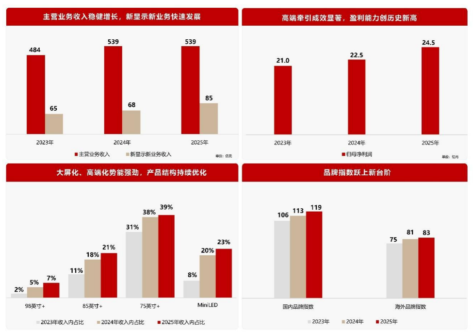 2025年,海信视像坚定不移推进“高端化、大屏化、智能化”战略,主营业务收入稳健增长,第二曲线新显示新业务表现亮眼。报告期内,新显示新业务实现主营业务收入84.58亿元,同比增长24.92%,成为公司重要增长引擎。