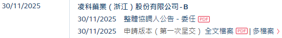 2025年11月30日,来自浙江杭州钱塘新区的凌科药业(浙江)业股份有限公司LYNK PHARMACEUTICALS CO., LTD.(以下简称“凌科药业”)向港交所递交招股书,拟香港主板IPO上市。