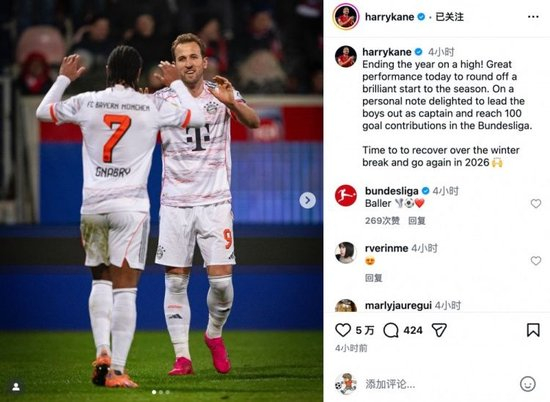 凯恩写道:“以一场胜利收官这一年!今天的出色表现为本赛季的精彩开局画上了圆满句号。尤其令我欣喜的是,能以队长身份带领队友出战,并达成了个人在德甲联赛中参与100粒进球的里程碑。”
