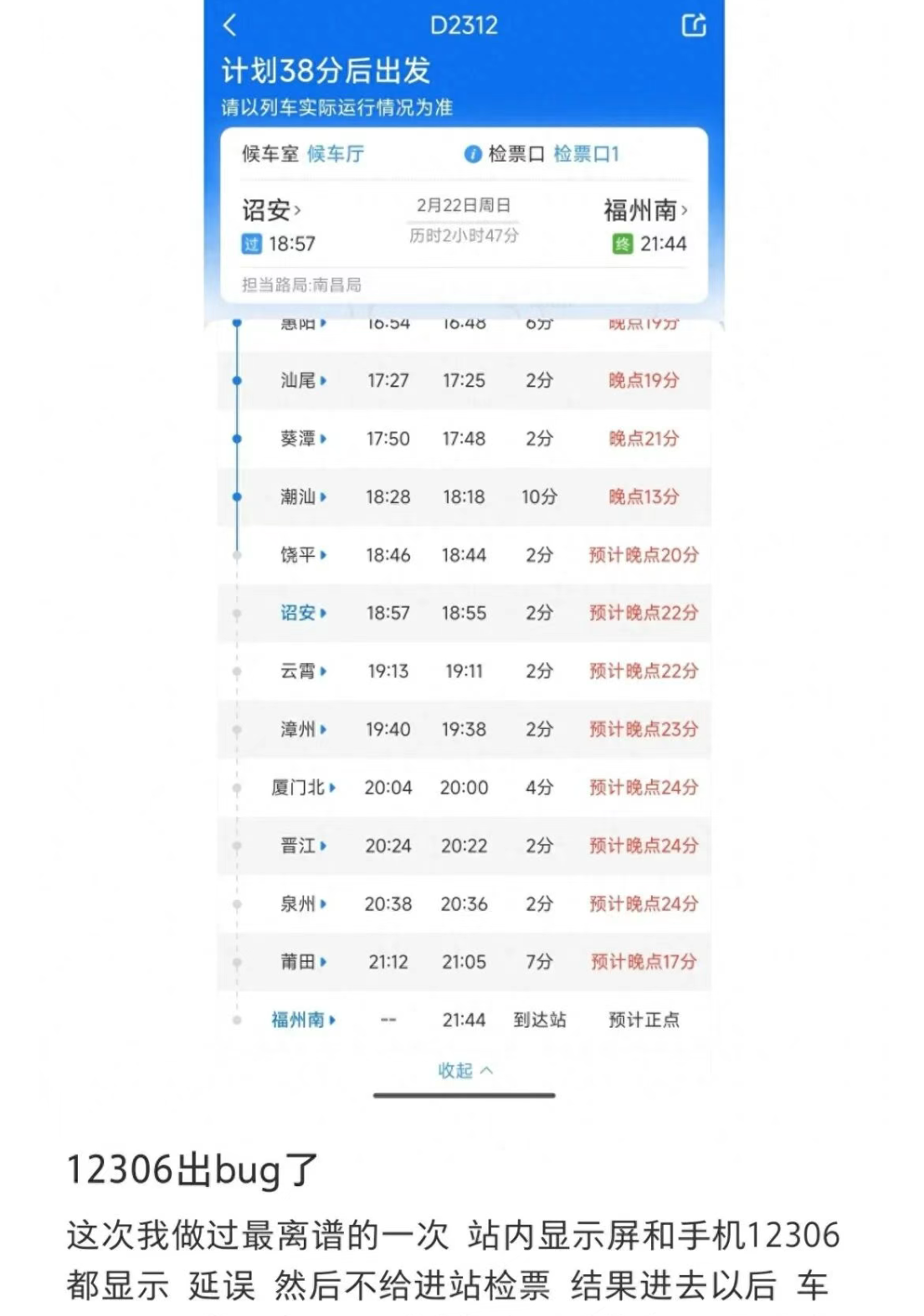 然而在完成检票进站后,旅客却发现列车已准点开走,包括其在内的多名旅客只能在站台原地等候许久,后续行程也被打乱。