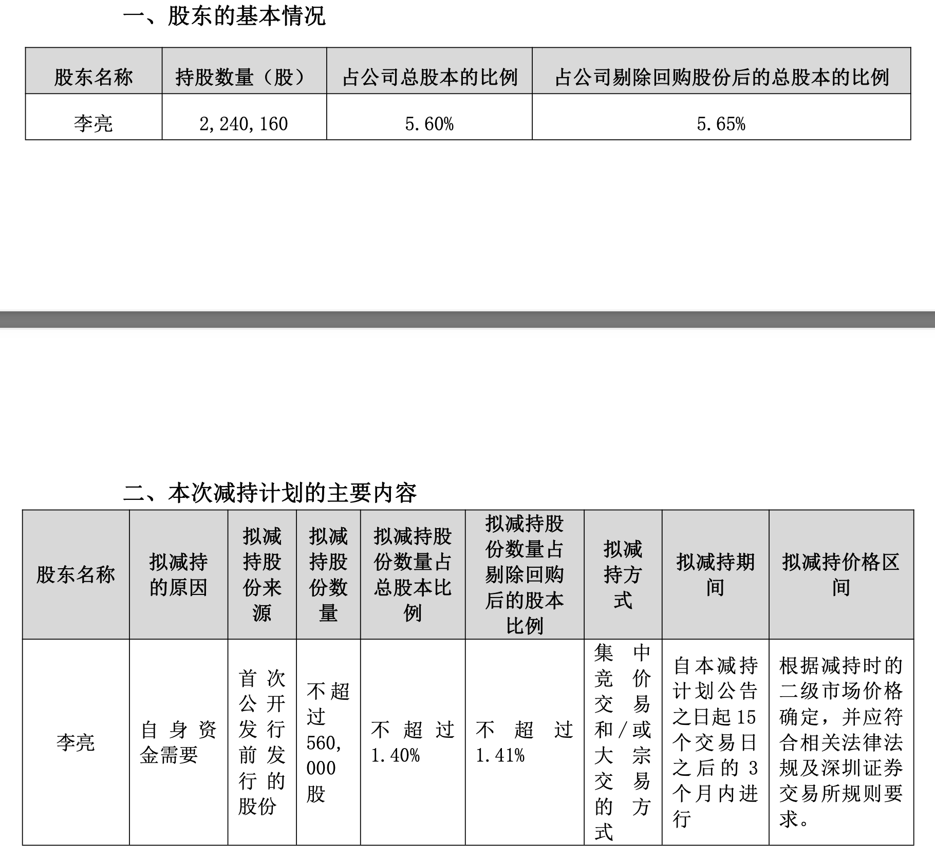 据悉,李亮减持原因为自身资金需要,股份来源为首次公开发行前发行的股份。截至目前,李亮持股数量224.02万股,占趣睡科技总股本比例为5.6%,占公司剔除回购股份后的总股本的比例5.65%。