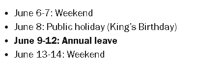 2026 年多数州的 King’s Birthday 是 6 月 8 日。如果你在那周请四天年假,同样能把假期拼到九天,前后连着周末一起休。