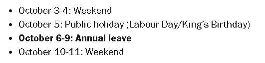 不同州的劳动节假期也能采用同样的方式,维州 3 月的 Labour Day、其他州不同时间的公共假期,只要假日落在周五或周一,你就能把它变成九天长假。这一年里其实到处都是“拼假窗口”。