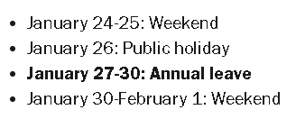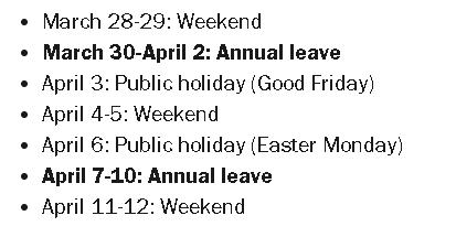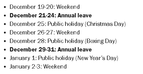 如果想要更多长周末,可以自己“拼假”:比如请休 1 月 2 日(周五)或者在墨尔本杯前的周一请假,直接凑一个超长周末。