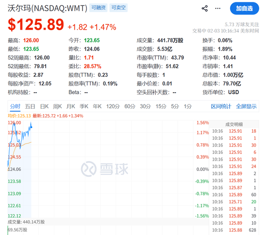该股上涨超1%,盘中触及每股126美元的历史新高,并将公司市值推升至略高于1万亿美元。沃尔玛股价今年以来累计上涨12%,跑赢标普500指数同期1.9%的涨幅。