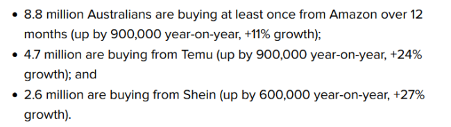 Roy Morgan的最新数据显示,Amazon、Temu和Shein正在快速抢占澳大利亚市场份额。Amazon用户达880万,同比增长11%;Temu用户470万,增长24%;Shein用户260万,增长27%。