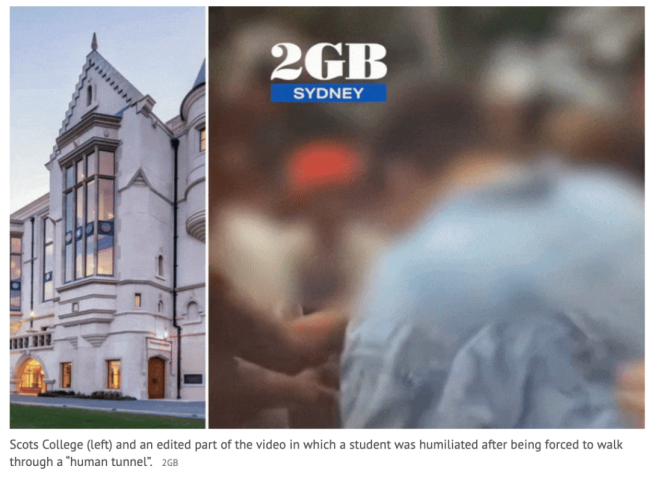 Scots College一名17岁男生似乎被迫从一排排男生中间走过,一路上被骂、被羞辱,还有人往他身上泼啤酒。