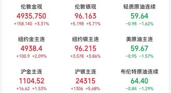 贵金属方面,伦敦金现货价格收涨3.31%,报4935.75美元/盎司;伦敦银现货价格大涨近6%。沪金、沪银主力合约也大幅上涨。