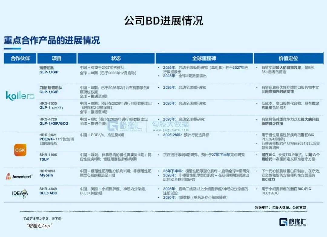 其中包括具备同类最佳潜力的GLP-1/GIP双受体激动剂瑞普泊肽(HRS9531)用于超重/肥胖有望获批;瑞康曲妥珠单抗有望获批用于HER2阳性结直肠癌、一线乳腺癌等多个新适应症。